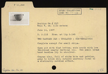| Description: | Complete except for small chips. Open pot with flat bottom; wide mouth with low thickened nearly vertical lip. Two small broad band handles lip to shoulder. Coarse clay, full of white bits and pebbles, gray to brick red; outside unevenly fired to a distinctly mottled effect. | |