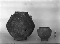 | Description: | Complete. Small sub-Neolithic jar with high foot, deeply concave below. Round body; wide mouth with more or less vertical rim and plain lip. Two small horizontally pierced lugs high on shoulder. Brownish coarse clay; considerable remains of a red slip. | |