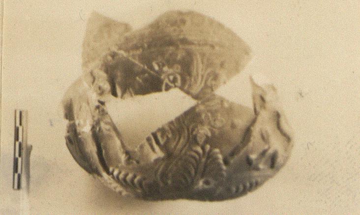 Description:   About one-third of body, none of lip preserved. At bottom, neat double rosette surrounded by an incised groove; above, tall palmettes alternating with grape tendrils bearing leaves and clusters, which reach to the upper ornament band. Above each palmette, and between the tendrils, wrestling and fighting scenes in relief. On the rim, a running ivy band between dots; a band of reverse spirals, and rosettes alternating with fleurs de lys. A non-joining fragment preserves part of a figure, nude save for a cloak hanging behind his back, riding right on an animal. A bit of floral ornament at the left. A small fragment from the upper ornament also does not join.