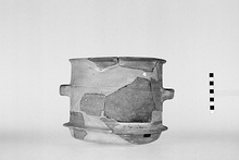 | Description: | Fragmentary; partly restored in plaster The rounded bottom, which probably had a ring foot, is entirely missing. It is separated from the straight vertical side wall by a projecting flange. Outward projecting lip to receive the lid, with vertical inner lip. Horizontal band handles half way up the body, which is grooved at the upper edge of the handle attachment. The whole upper body covered with a white slip over which pink was applied; with a red band above the lower flange, and below the lip. | |