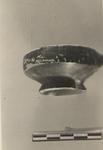 | Description: | Most of the horizontal rolled handle broken away; lip and foot chipped. High flaring ring foot and straight vertical rim, forming an angle with the lower wall. Dull black glaze, somewhat peeled; irregular over the lower part; underside of foot unglazed. | |