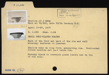 | Description: | Much of the foot and part of the rim and wall missing; restored in plaster. Shallow body on ring foot; projecting rim. Horizontal rolled handles set just below rim. Streaky black to brownish glaze inside and on top of rim only. | |