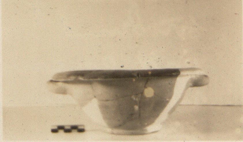 | Description: | Much of the foot and part of the rim and wall missing; restored in plaster. Shallow body on ring foot; projecting rim. Horizontal rolled handles set just below rim. Streaky black to brownish glaze inside and on top of rim only. | |