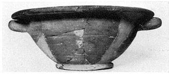 | Description: | Much of the foot and part of the rim and wall missing; restored in plaster. Shallow body on ring foot; projecting rim. Horizontal rolled handles set just below rim. Streaky black to brownish glaze inside and on top of rim only. | |