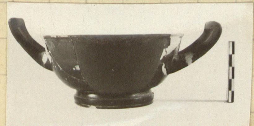 | Description: | Both handles broken off, and more than half the side walls missing. Restored in plaster. The sides show a slight S-curve. Inside, 0.021m. below the top, the lip is inset slightly. Moulded foot. On the bottom, a triple rouletted circle, enclosing four stamped palmettes, widely spaced. Scratched groove at junction of body and foot. Clay in part fired gray. Firm black glaze, slightly metallic; resting surface unglazed; area inside the foot unglazed, decorated with concentric rings. Cf. Hesperia 24 (1955), p. 185, under no. 25. | |