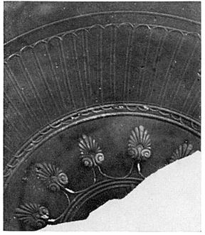 | Description: | Three fragments; none of the rim preserved. Shallow stemless cup on moulded ring foot; rim plain outside, offset inside. Trace of stamped palmettes at center of floor, then a triple groove ring, and a ring of stamped linked palmettes, surrounded by a triple groove and a band of tongues. Scraped groove above foot, and reserved bands with lightly ridged edges, beneath. Glaze good outside, inside thin and much grayed. | |