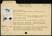| Description: | Much of wall and rim missing; restored in plaster. Thin-walled type, similar to P 10995 (ΠΘ 2915) in shape and fabric, but larger. Above foot, reserved band filled with latticed lines. Also reserved, a band inside the lip, the handle spaces, the insides of the handles, and the bottom inside the foot, decorated with glazed dot and circles. Black glaze somewhat grayed; traces of stacking. Cf. Agora XII, no. 321. | |