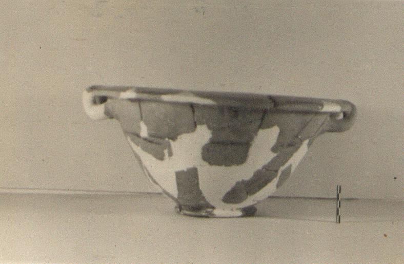 | Description: | Fragments of walls and of both handles missing; restored in plaster. Flaring ring foot and projecting rim very slightly convex on top. Rolled horizontal handles, turned up vertically to join the rim. Black glaze inside, somewhat peeled. Two glaze bands on rim; one outside, below handles; foot glazed. | |