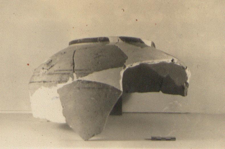 | Description: | The shoulder and low straight vertical rim preserved; strengthened in plaster. One horizontal rolled handle on shoulder, missing. Glaze bands below handle on shoulder, and glaze on lip. Coarse gritty pinkish-buff clay with light slip. | |
