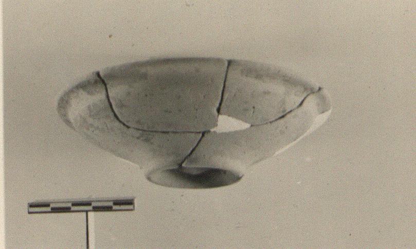 | Description: | Shallow body on ring foot; flat projecting rim. Two groove rings around center of floor. Pink clay; red glaze, much peeled. | |