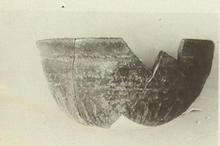 | Description: | Rather more than half of the walls preserved; no bottom; strengthened with plaster. Flaring lip, faintly offset. Radiate long petals cover the walls to about half their height. Between each pair of tips, a raised circle. Above, a broad zone bounded above and below by raised lines, and filled by a series of debased palmettes. Dull gray clay. Flaky black glaze. | |