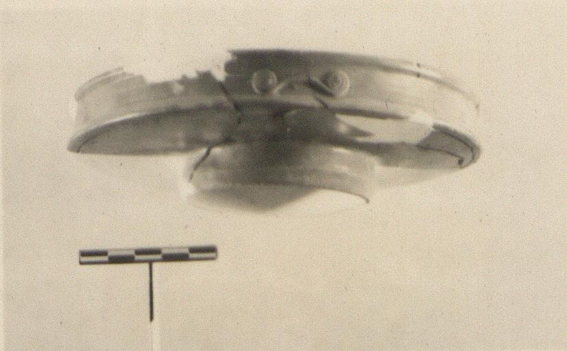 | Description: | About half preserved; restored in plaster. High ring foot, flat floor, and vertical rim, keeled below and rounded at the lip. Double groove around the floor; the center with the stamp, not preserved. Spiral volute, upside down, applied on outside of rim. Western Sigillata. | |