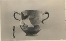 | Description: | Part of the wall and rim restored in plaster. Convex lower body; upper wall slightly concave; plain rim. Moulded ring foot with an incised groove; another at junction of upper and lower body, and around foot. Ivy leaf thumb-rests on the band handles. In handle zone, necklace with hanging pendents and row of dots above, in terracotta paint. Dull black glaze. | |