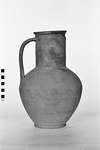 | Description: | Part of neck and lip missing. Low flat projecting base and plump ovoid body; straight neck with slightly flaring lip and a raised ring below at the attachment of the band handle. Pinkish-buff clay. Traces of creamy slip; unglazed. | |