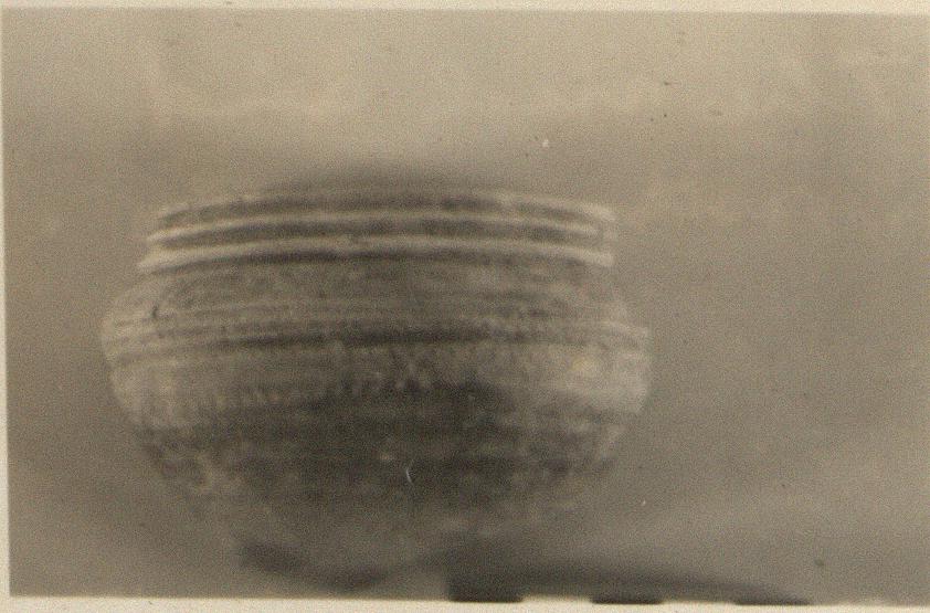 | Description: | Fragment with part of the straight rim, grooved on its outer face. Rounded shoulder with two grooves at the point of greatest diameter, and rouletted bands above and below. No traces of handles (but one or two possible). Thin brownish glaze to above foot. Cf. Agora V, under no. H 10, p. 47, pl. 68. | |