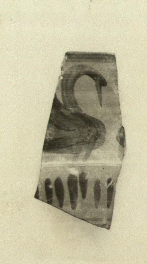 | Description: | Broken all around save upper edge which preserves part of the simple rim. In thin red-brown glaze water bird right. Below the bird the body of the vase swells out: decorated with row of vertical short strokes. Back of the bird missing; part of another(?) preserved along right edge of fragment. Top of rim, alternately reserved and glazed. Inside unglazed save for rim band. Cf. CVA Oxford III H, pl. 13, 4-8. Cf. Hesperia 13 (1944), p. 57, V. Cf. Graef and Langlotz, Akrop. Vasen , pp. 61-63. ADDENDA Second fragment added. | |