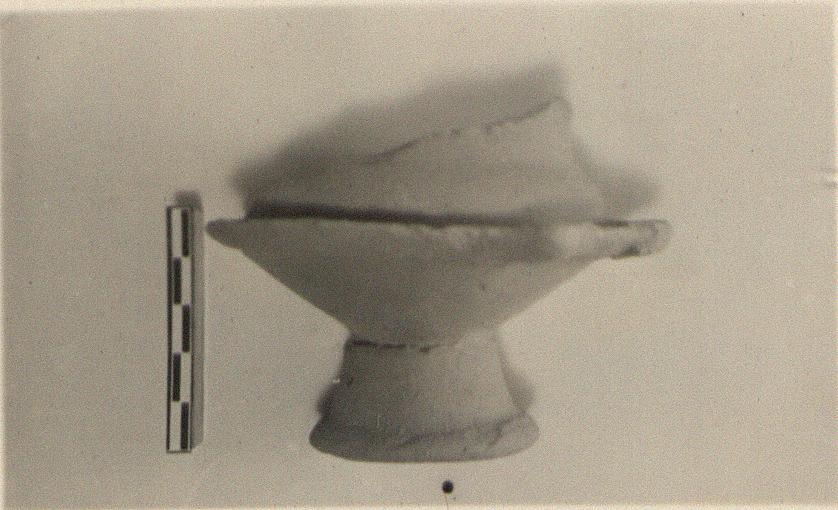 | Description: | The rim missing; and part of the bowl, flange, and base. Truncated conical stand with rounded lower edge; shallow convex lower body, separated by a projecting flange with horizontal handles; holes through the flange by the handle attachments. Soft buff clay, traces of white slip. | |