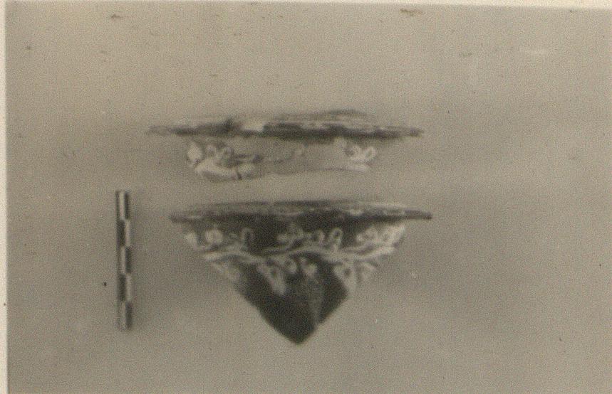 | Description: | Two non-joining fragments of a flanged pyxis; on the upper face of the flange, a row of white dots; below it, an elaborate grapevine band with hanging clusters in terractota paint. Glaze black to reddish-brown. | |