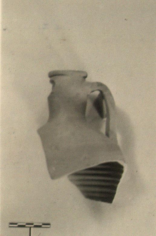 Description:   Mouth, one handle and part of shoulder and wall remain. Plain amphora with bulging cylindrical neck and strap handles; projecting rounded lip. Body slightly wheel ridged.