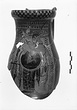 | Description: | Mended from many pieces. Lower part missing, with entire base (restored in plaster), also interior fragments including the face of Dionysos. Ridged handle with projection on either side at attachment. Round mouth with moulded lip; top edge colored red. The figured panel is right of center and depicts Athena and Dionysos. Athena's shield covers the upper part of the two close-standing figures; they both face left. Red is used for helmet, crest, beard, alternate leaves of ivy wreath, rim of shield, hair(?) of Athena, garment folds and ornaments; white (poorly preserved) for flesh of Athena, shield emblem (a bent leg), dots on dress and helmet. Beard of Dionysos appears over edge of shield; for neck of Athena the white has been painted over the glaze, the incision of the shield border has been interrupted and the red shows a broken edge overlapping the white. A little above this point the wall of the vase received a dent before firing. Glaze thin across back. Fine fabric. Cf. Beazley (1928), Greek Vases in Poland, p. 11 and n. 4. | |