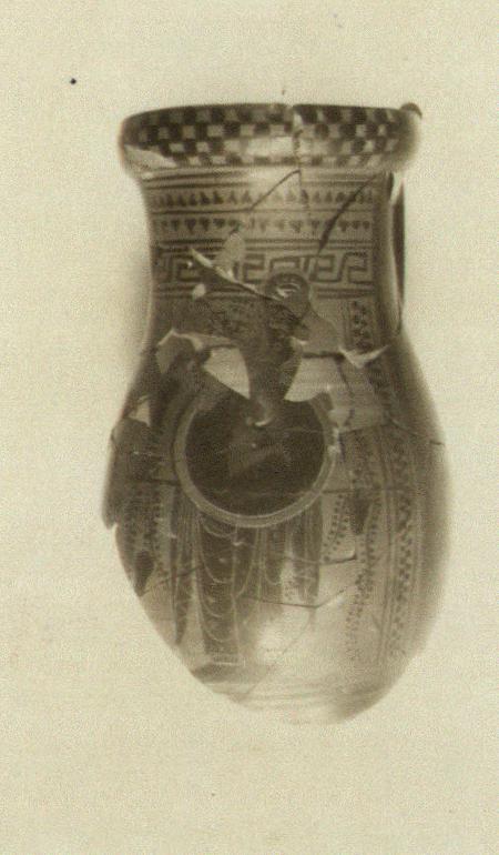 | Description: | Mended from many pieces. Lower part missing, with entire base (restored in plaster), also interior fragments including the face of Dionysos. Ridged handle with projection on either side at attachment. Round mouth with moulded lip; top edge colored red. The figured panel is right of center and depicts Athena and Dionysos. Athena's shield covers the upper part of the two close-standing figures; they both face left. Red is used for helmet, crest, beard, alternate leaves of ivy wreath, rim of shield, hair(?) of Athena, garment folds and ornaments; white (poorly preserved) for flesh of Athena, shield emblem (a bent leg), dots on dress and helmet. Beard of Dionysos appears over edge of shield; for neck of Athena the white has been painted over the glaze, the incision of the shield border has been interrupted and the red shows a broken edge overlapping the white. A little above this point the wall of the vase received a dent before firing. Glaze thin across back. Fine fabric. Cf. Beazley (1928), Greek Vases in Poland, p. 11 and n. 4. | |