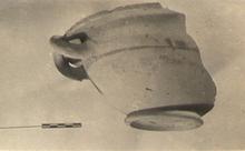 | Description: | About two-thirds of rim and upper wall, including one handle, missing. Flaring foot ring; broad, flat slightly down-turned rim. Horizontal handle, below rim, turned up to join outer edge of rim. Buff clay; fairly fine; glaze for horizontal band at base of handles, band around outer edge of rim, and inside of bowl, red to brown, largely peeled. | |