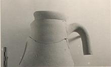 | Description: | Part of rim and one handle, most of neck preserved; rounded flaring lip. At either side, just above shoulder: <graphic> Fairly fine clay, dark, dull, almost greenish-buff, tending to be streaky at surface. | |