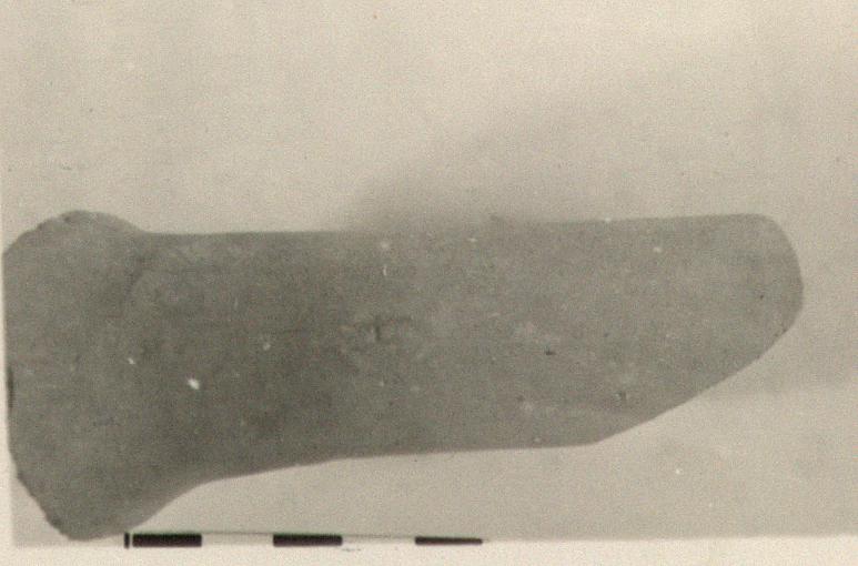 | Description: | Lower end of handle of relatively small size. Scratched vertically near base of handle: <graphic> Deep pink micaceous clay, brown at surface; trace of light slip. | |