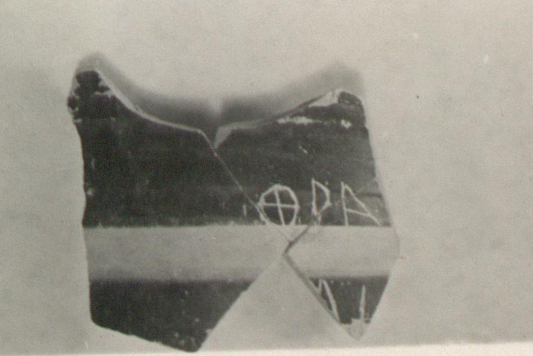 | Description: | Fragment from wall of a large fairly straight-sided cup or bowl with slightly flaring lightly ribbed rim. Graffito on outside: <graphic> Pinkish-buff micaceous clay; dull black glaze inside and out; a single reserved band well below the rim on the outside. | |