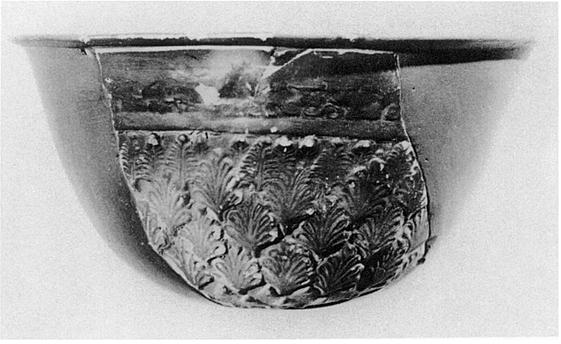 | Description: | Restored in plaster. Body covered with leaves of varying sizes, to a band below spiral border; traces of further pattern above, not clear. Scraped line below out-turned lip. Dull black to reddish glaze. | |