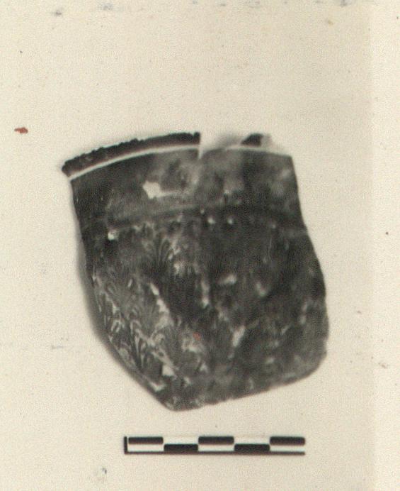 | Description: | Restored in plaster. Body covered with leaves of varying sizes, to a band below spiral border; traces of further pattern above, not clear. Scraped line below out-turned lip. Dull black to reddish glaze. | |