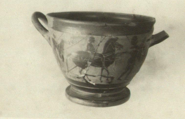 Description:   Depicts youth on horseback between two on foot. Mended from many fragments; interior pieces and most of one handle. Surface badly worn, especially on one side. The footmen each hold up a chlamys. Behind the rider, a bird (not accidental: repeated). A fair amount of incision, not too careless. Offset lip, reserved on top. Narrow moulded band above base; beneath, the dot and circle missing from reserved center.