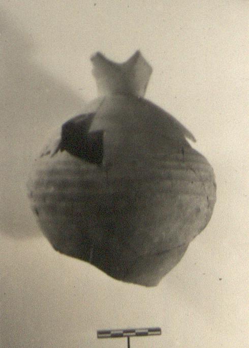 | Description: | Bottom, handle, most of lip and much of wall missing. Partially restored in plaster. Plump jug, the point of greatest circumference near the middle. Narrow flaring neck-mouth. Ribbed, coarseware; red core, brownish exterior. | |