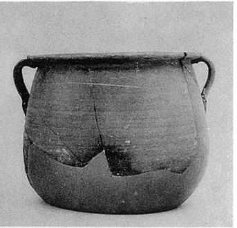 | Description: | The bottom missing, much of the wall, and a piece of the rim. Ribbed and round-bodied two-handled pot with slightly flaring rim. Red-brown clay, blackened outside. | |
