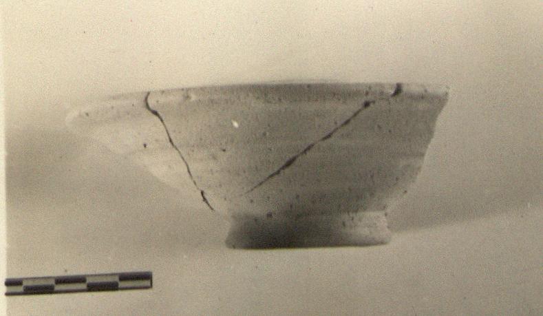 | Description: | The bottom and about one-third of the wall and rim preserved. An unglazed saucer with flaring sides and flat rim; ring foot. Pinkish-buff clay; traces of white inside(?). | |