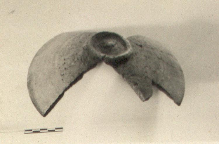 | Description: | About half preserved; restored in plaster. Conical lid with a ridge around a peak on the top for a knob. Heavy cooking ware fabric, considerably blackened. | |
