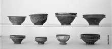 Description:   Chips missing from lip; restored in plaster. Sharply flaring sides; ring foot; carinated rim.