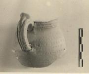 Description:   Fragment of a small round-bodied mug or jug; one handle with part of the wall and rim preserved. Round neck-mouth, vertical outside, concave inside; grooved on the outside. Grooved vertical handle rising above the lip; a small round thumb-rest on its top. Bands of rouletted nicking cover the shoulder.