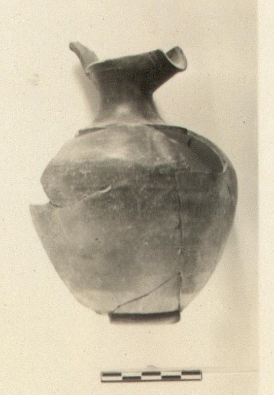 | Description: | Oinochoe with beaked spout. About half preserved; most of the handle and much of the base missing. Restored in plaster. Small eggy body; low ring foot; short narrow neck with flaring lip plain with two grooves outside, at the back; but at the front, finished with a projecting spout, cut away above and grooved around its lip beneath. High swung grooved handle. Brownish-red clay; black glaze on lip outside not reaching to the bottom, and on inside of lip. | |