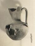 | Description: | Fragment of lip and parts of wall missing. Flat bottom; squat rounded body; tall neck widening to trefoil lip. Grooves around lip outside. Ridged band handle, below lip to shoulder. Coarse red cooking ware clay; the outside slightly blackened. | |
