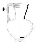 | Description: | Fragment of lip and parts of wall missing. Flat bottom; squat rounded body; tall neck widening to trefoil lip. Grooves around lip outside. Ridged band handle, below lip to shoulder. Coarse red cooking ware clay; the outside slightly blackened. | |