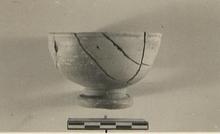| Description: | Chip missing from lip; restored in plaster. Plain deep Pergamene bowl on high moulded foot. Groove around lip outside. Poor red glaze over all. | |