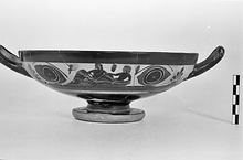 | Description: | Mended from many fragments. Missing less than a third of the rim, a chip from the base, and small interior chips. Two reclining figures on either side, facing left. Blobby filling ornament at level of their heads. Accessory red for fillets and garment folds, white for the garlands around their necks and for the central dot on the outer part of the eye ornament. Scene on the other side very fragmentary; slight variation in pose. Interior glazed save narrow reserved band, at rim and reserved center with dot within circle. Resting surface of the base reserved and top of hollow inside. The very short stem colored red. | |