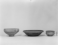 | Description: | Fragments of rim, body and base missing; complete profile preserved. Open bowl on small flat bottom; shallow concavity below plain vertical lip. Pinkish-buff clay. Traces of light buff slip. | |