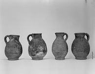 | Description: | Most of mouth missing, otherwise intact. Ovoid body on thick ring foot. Slight ribbing on body; two grooves on neck. Gouged decoration on upper part of body: at center, a sort of pyramid; on either side, crossing diagonals. Dull red glaze inside mouth and upper outside. | |
