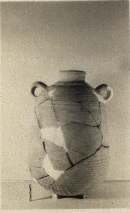 | Description: | Part of one handle and fragments of body missing; restored in plaster. Broad round bottom; low straight neck; two vertical ring handles. Ribbing on body, most prominent above and below. Decoration in white: spiral and interlacing curved lines running vertically. Unglazed. Cf. P 9788 (Φ 235). | |