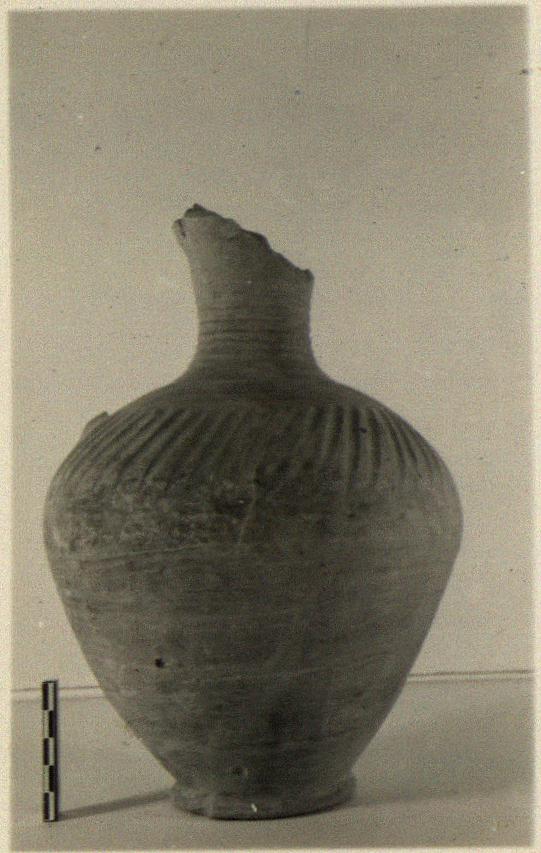Description:   Mouth and handle missing, otherwise intact. Ring foot; ovoid body; narrow high neck with ribbing on outside below; above plain, and widening towards lip. Slanting gouged lines on upper part of body.