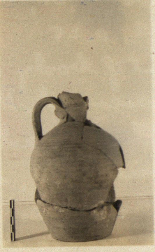 | Description: | Mouth and considerable parts of body missing. Restored in plaster. Flat bottom; plain band handle. Body lightly ridged; grooves around neck at upper handle attachment. Coarse red clay. Unglazed. | |