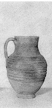 | Description: | Part of mouth missing; otherwise intact. The shape much as P 11576 (Φ 513), but the mouth slightly flaring. Ribbing on body. Buff clay. Thin dull light brown glaze, except toward foot. | |