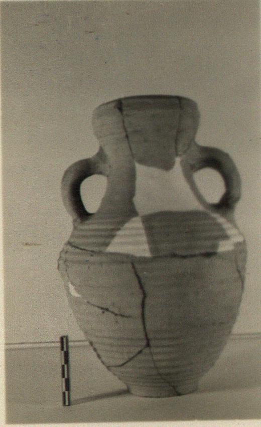 | Description: | Fragments of body missing; restored in plaster. Bulging lip, ridged; two small vertical handles; ribbed body. Buff clay. Unglazed. | |